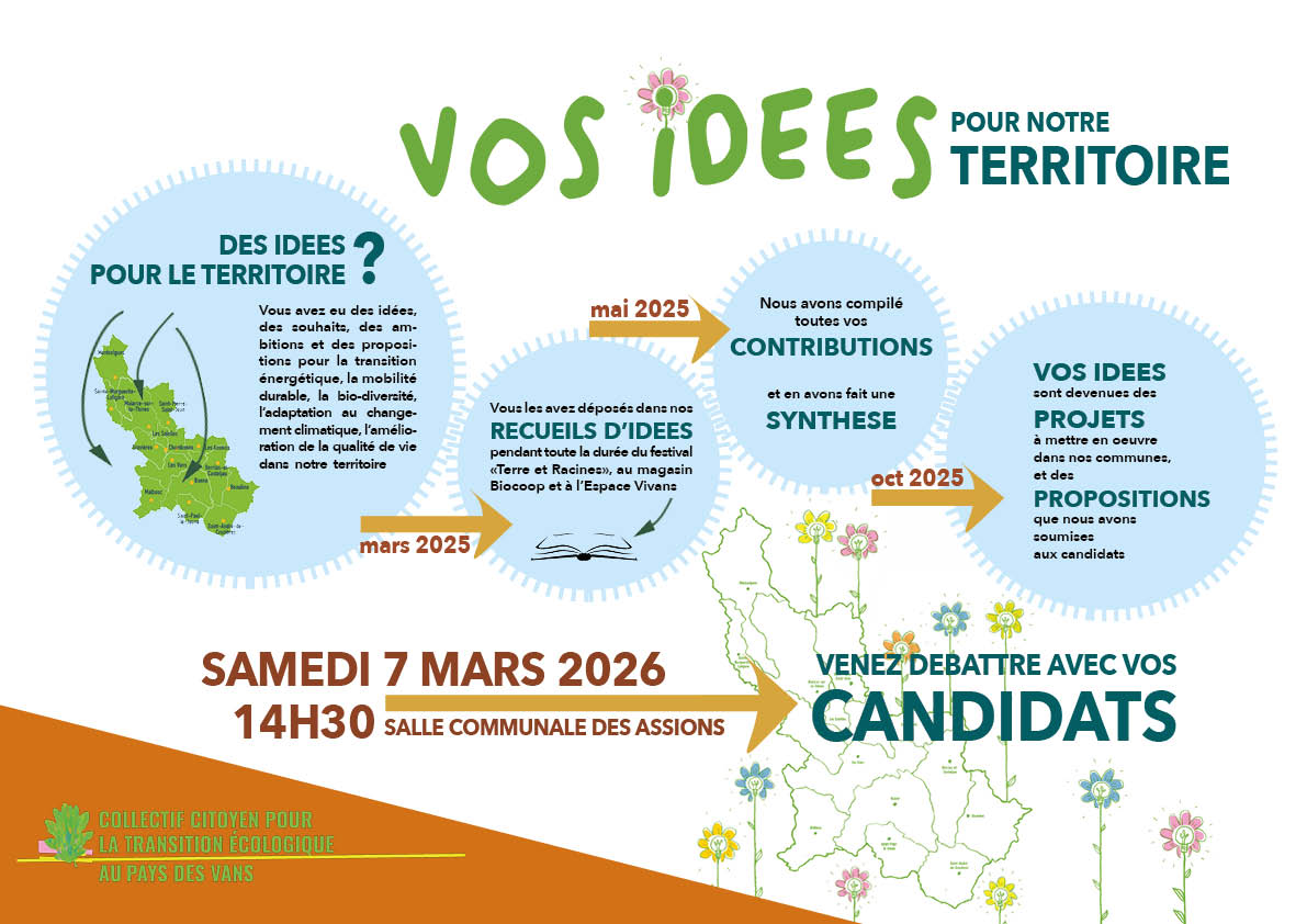Pendant la durée du festival Terre & Racines, du 26 février au 29 mars dernier, le Collectif Citoyen a collecté dans 2 Recueils d’Idées (disponibles au cinéma Vivans et au magasin Biocoop) vos propositions, suggestions, idées, projets… pour la transition écologique dans notre territoire.